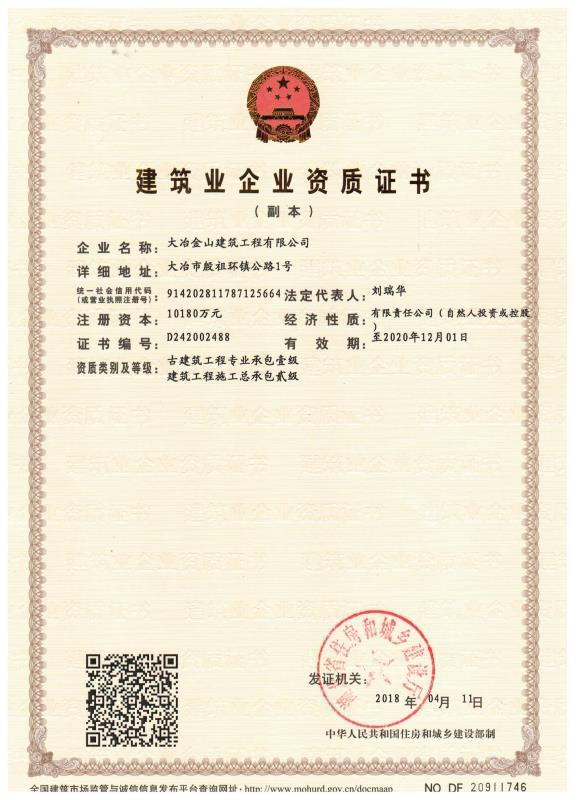 大冶金山建筑工程有限公司始建于1984年,屬鎮(zhèn)辦集體企業(yè)。1997年改制為大冶山建筑工程有限責任公司,屬股份制企業(yè)。2013年更名為大冶金山建筑工程有限公司,2018年3月公司資源重組,公司注冊資金達到10180.00萬元,公司法定代表人為劉瑞華。公司具有古建筑工程專業(yè)承包壹級、建筑工程施工總承包貳級、市政工程總承包叁級、鋼結構工程專業(yè)承包叁級資質。